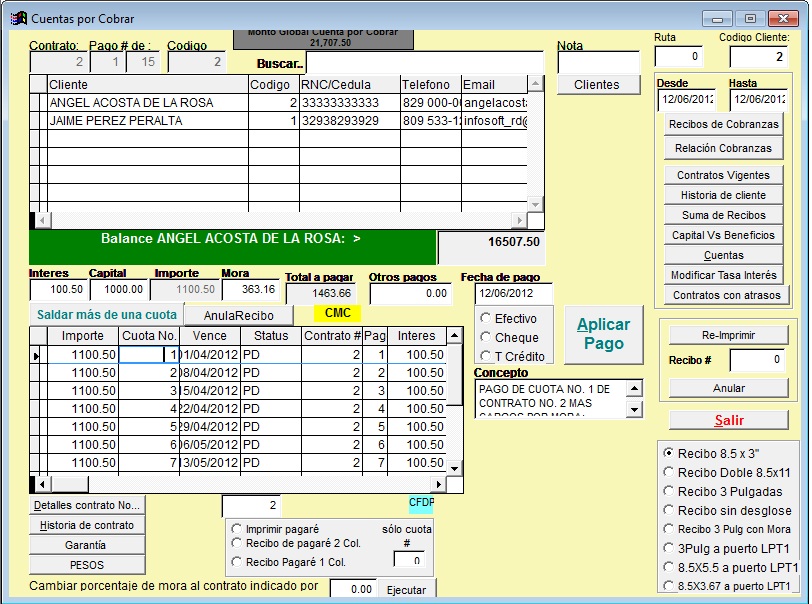 16. Los recibos de cobranza le permiten imprimir para darlos a los clientes como constancia de pago. Sin embargo, hasta que usted no APLIQUE EL PAGO a la cuota, el balance del cliente seguirá sin modificarse. Suelen ser entregados a los cobradores, quienes quedan con una copia si pueden realizar la cobranza.