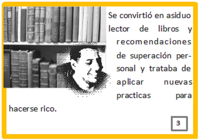 Se convirtió en asiduo lector de libros y recomendaciones de superación personal y trataba de aplicar nuevas practicas para hacerse rico.