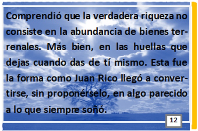 Comprendió que la verdadera riqueza no consiste en la abundancia de bienes terrenales. Más bien, en las huellas que dejas cuando das de tí mismo. Esta fue la forma como Juan Rico llegó a convertirse, sin proponérselo, en algo parecido a lo que siempre soñó.