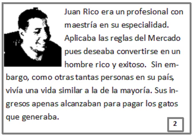 Juan Rico era un profesional con maestría en su especialidad. Aplicaba las reglas del Mercado pues deseaba convertirse en un hombre rico y exitoso. Sin embargo, como otras tantas personas en su país, vivía una vida similar a la de la mayoría. Sus ingresos apenas alcanzaban para pagar los gastos que generaba.