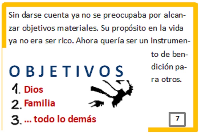 Sin darse cuenta ya no se preocupaba por alcanzar objetivos materiales. Su propósito en la vida ya no era ser rico. Ahora quería ser un instrumento de bendición para otros.